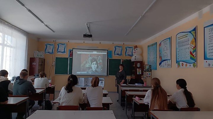 Библиотекарь школы Кононец С.В.  к 80-летию со дня Победы провела классный час «Подвиг Алии Молдагуловой» с учащимися 9-11 классов